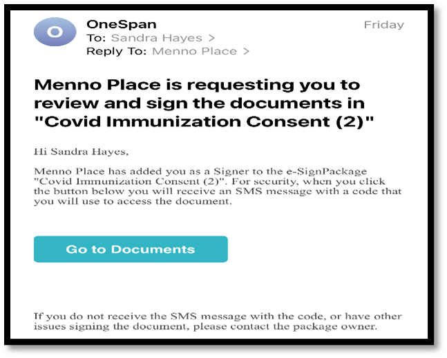 Note: The OneSpan system refers to documents as “packages” so you will see language like “Menno Place has added you as a Signer to the e-Sign Package “Covid Immunization Consent” for example.