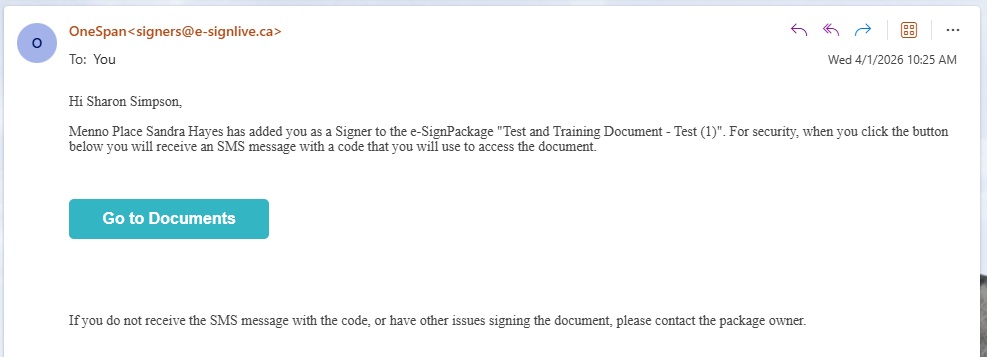 Note: Emails requesting consent will come from OneSpan signers@e-signlive.ca . The system refers to documents as “packages” so you will see language like “Menno Place has added you as a Signer to the e-Sign Package “Covid Immunization Consent” for example.