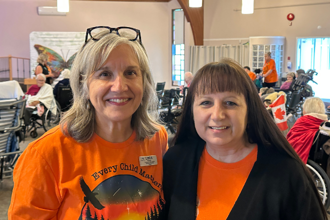 Linda Weatherly (L), Manager, Recreation and Volunteers and Bridget Findlay (R) MCCBC Indigenous Neighbours Coordinator share stories at the Menno Place Truth and Reconciliation gathering.
