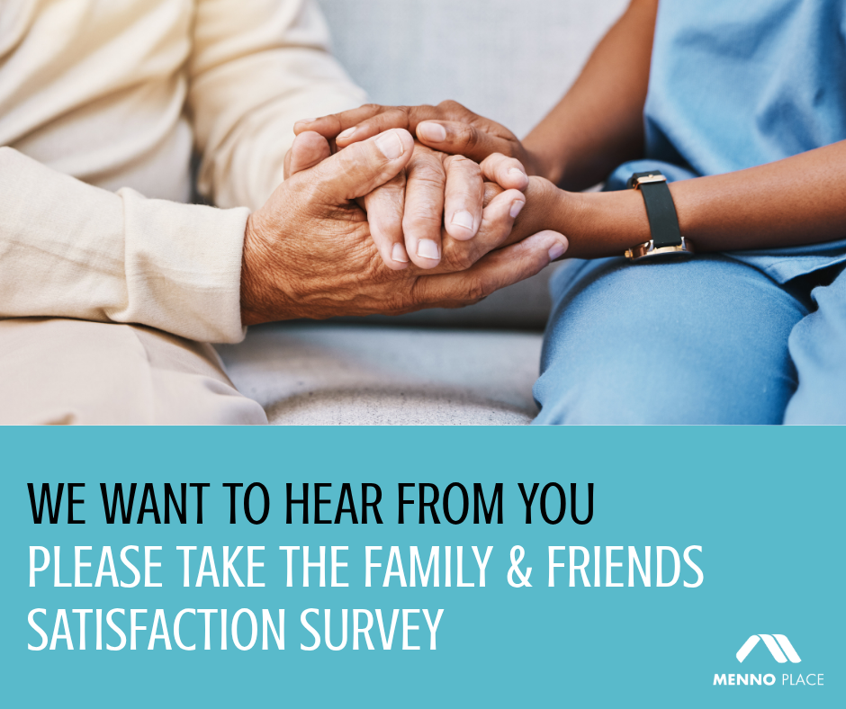 As a family member or friend of a Menno Place resident, your input matters. This survey takes only a couple of minutes and provides us with a wealth of information for both encouragement and improvement.